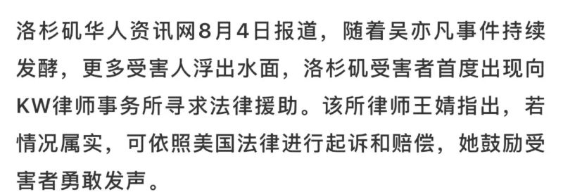 先來回顧一下,在美國當地時間8月4號,根據當地媒體報道,首度出現了洛杉矶受害人向KW律師事務所尋求法律援助的事件。而接受求助的該律師事務所的律師王婧指出,若情況屬實,將依照美國法律進行起訴和賠償。