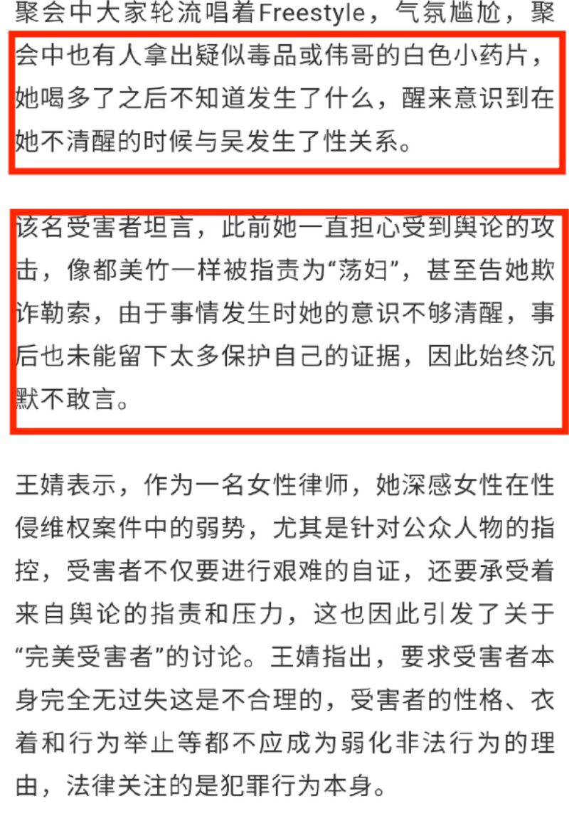 受害者表示,由于自己不敢與吳亦凡作對,且在事件發生時,神志並不清楚,事後也沒有能及時地保留證據。而吳亦凡作為一個頂級明星,她自己也害怕像“都美竹”一樣深陷輿論的攻擊,被網友罵“蕩婦”,甚至告她欺詐勒索。畢竟自己僅僅是一名普通的留學生,沒有能力與大明星以及龐大的粉絲群體對抗。