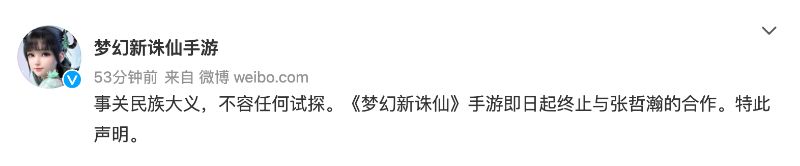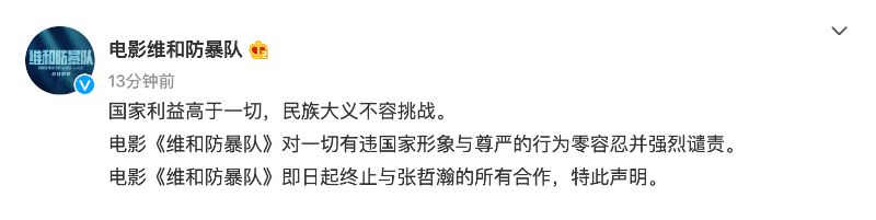 電影維和防暴隊終止與張哲瀚的所有合作!