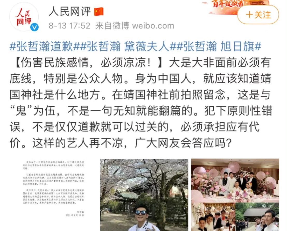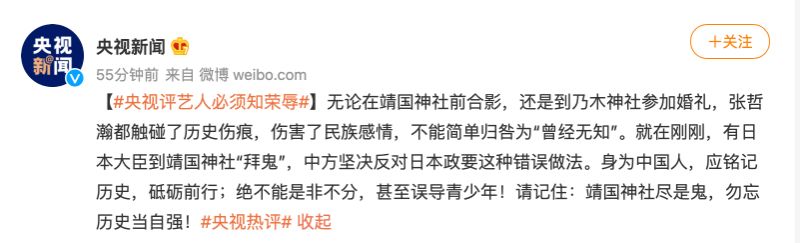而最有權威性的央視新聞也發聲,表示:「無論在靖國神社前合影,還是到乃木神社參加婚禮,張哲瀚都觸碰了歷史傷痕,傷害了民族感情,不能簡單歸咎為“曾經無知”。」