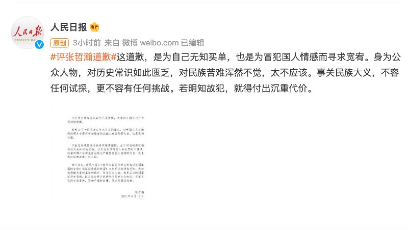 不少官媒紛紛站出來表態,當中人民日報原本發文,建議張哲瀚“多補課(補歷史課)”,被網友炮轟至修改成下文: