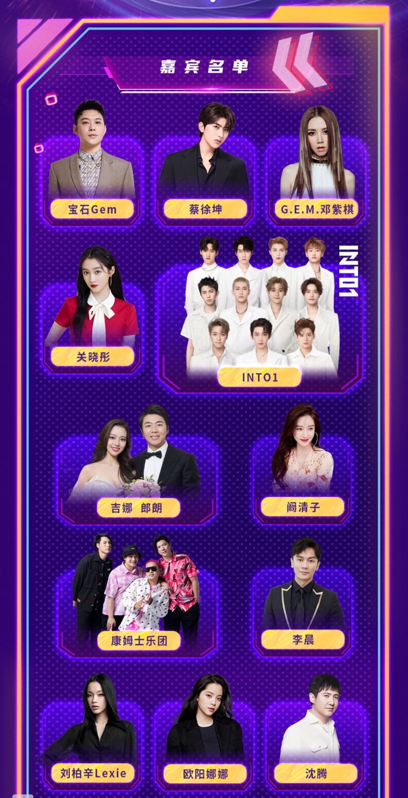 嘉賓陣容:蔡徐坤、王嘉爾、沈騰、關曉彤、阚清子、李晨、歐陽娜娜、宋雨琦、鄧紫棋、劉柏辛、王琳凱、王赫野、王菊、郎朗&吉娜、INTO1、THE9、硬糖少女303等。