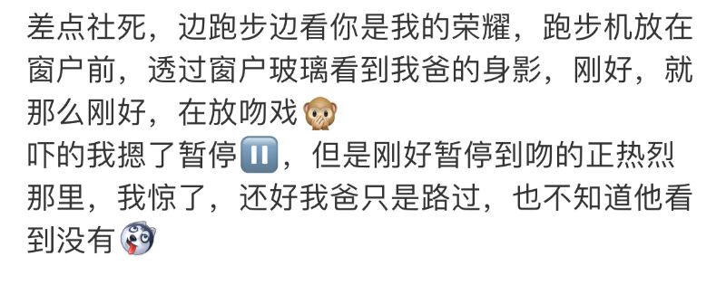 狀況:「看到我爸的身影,剛好,那麼剛好,在放吻戲,嚇得我摁了暫停⏸,但是剛好暫停到吻得正熱烈那裡,我驚了…」