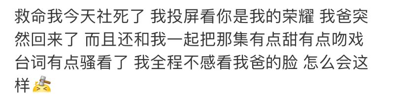 狀況:「我爸突然回來了,而且還和我一起把那集有點甜有點吻戲台詞有點騷的看了,我全程不敢看我爸的臉!」