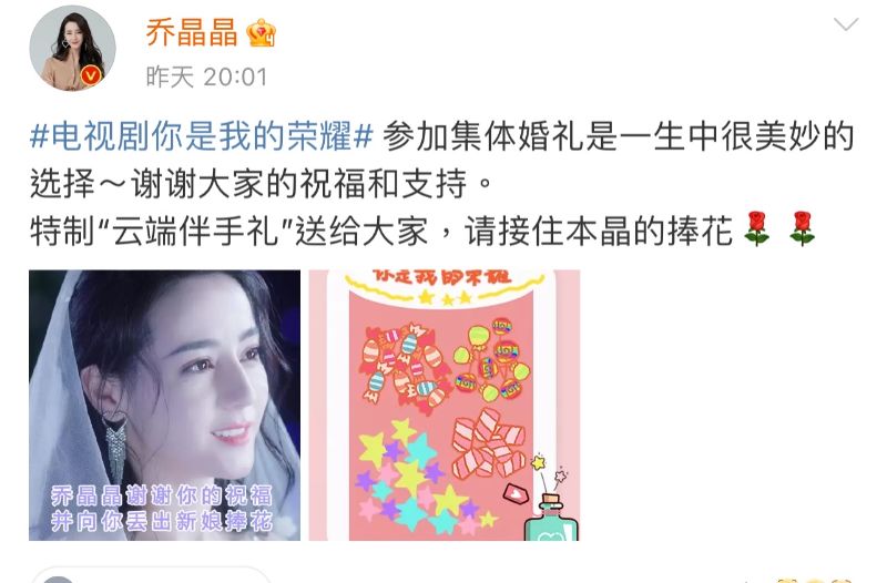 我們的大明星喬晶晶也發文公開自己的喜訊啦!晶晶表示:「參加集體婚禮是一生中很美妙的選擇~謝謝大家的祝福和支持。特製”雲端伴手禮“送給大家,請接住本晶的捧花」