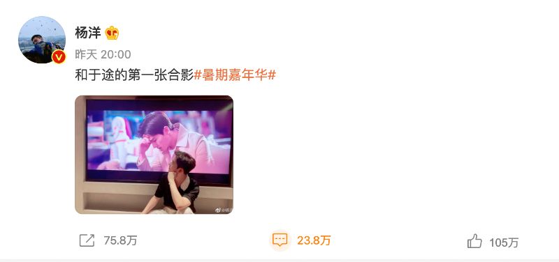 沒錯,楊洋在17號發了一張微博,配文:「和于途的第一張合影!」