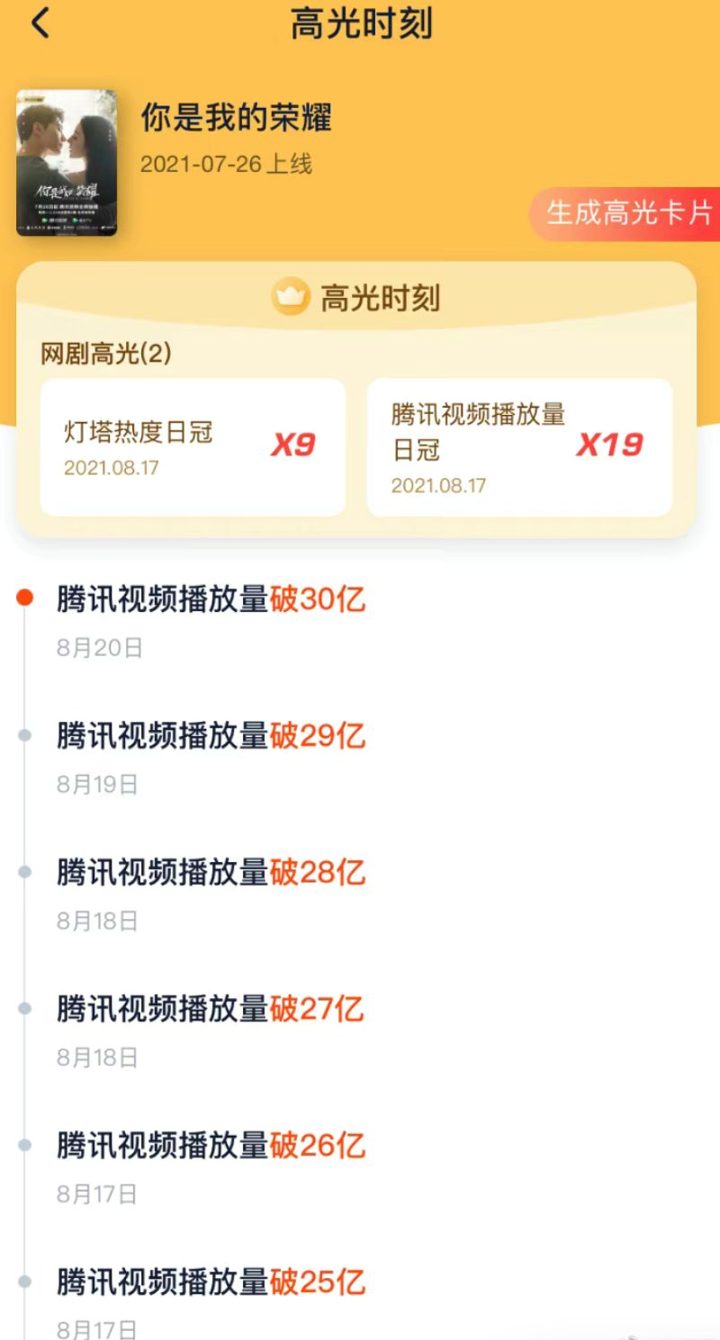 來看看從7月26日上線至今,《你是我的榮耀》奪下19次騰訊視頻播放量日冠軍,突破30億可以說成績很能打!