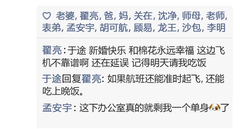 亮點來啦…來看看王彥霖飾演的翟亮的留言,居然是:「于途,新婚快樂!和棉花永遠幸福!這邊飛機不靠譜啊,還在延誤,記得明天請我吃飯!」而于途則回復:「如果航班還能準時起飛,還能吃上晚飯。」