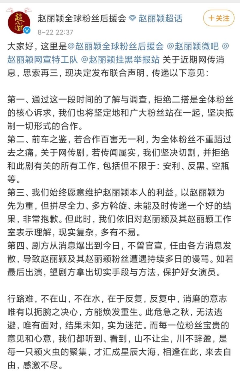 雖然劇方都沒官宣,但趙麗穎粉絲大量發文並艾特趙麗穎工作室,揚言將抵制新劇!隨後,在22號晚間11點多,趙麗穎全球後援會、微博、反黑站等粉絲組織,都發文表示如果真的二搭,將堅決切割,並拒絕和此劇有關的所有工作,包括但不限於:安利、反黑、控評等。