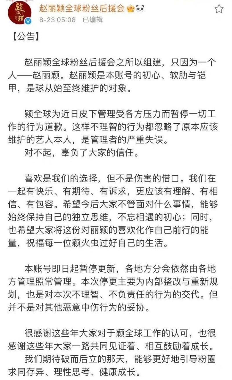 不過在23號凌晨5點,後援會再次發文,這次卻畫風全變,表示為不理智的行為道歉,並表示接下來會暫停更新。