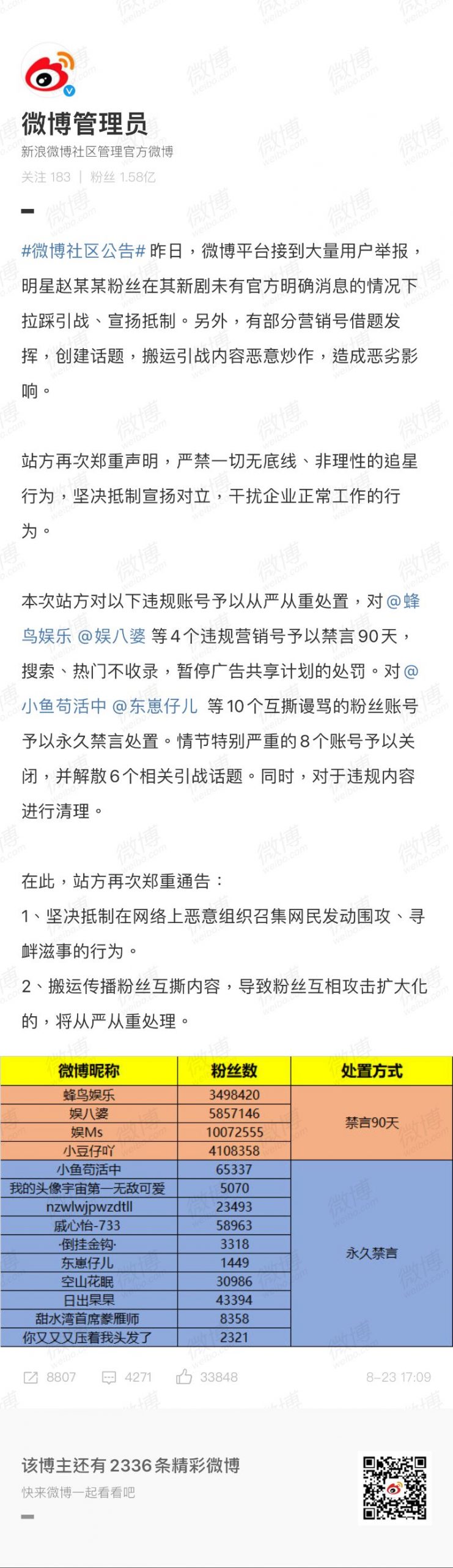 但沒想到在23號傍晚,微博管理員發佈公告,表示:「明星趙某某粉絲在其新劇未有官方明確消息的情況下拉踩引戰、宣揚抵制。」、「站方再次鄭重聲明,嚴禁一切無底線、非理性的追星行為,堅決抵制宣揚對立,幹擾企業正常工作的行為。」