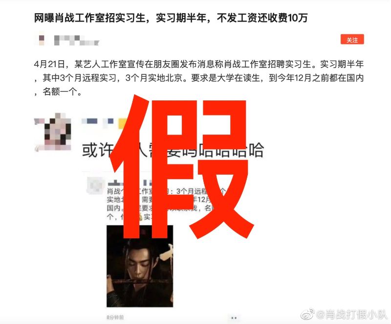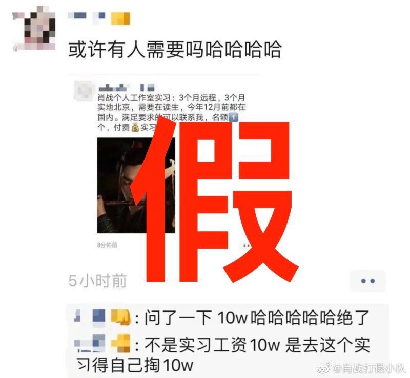 嗯?怎麼回事?打假小隊公開了兩張網絡截圖,第一張表示肖戰工作室招收實習生,實習期半年,不發工資還收費10萬!而且還列明了需要3個月遠程實習,3個月北京實習。