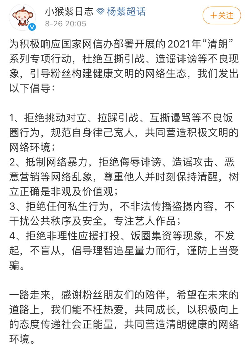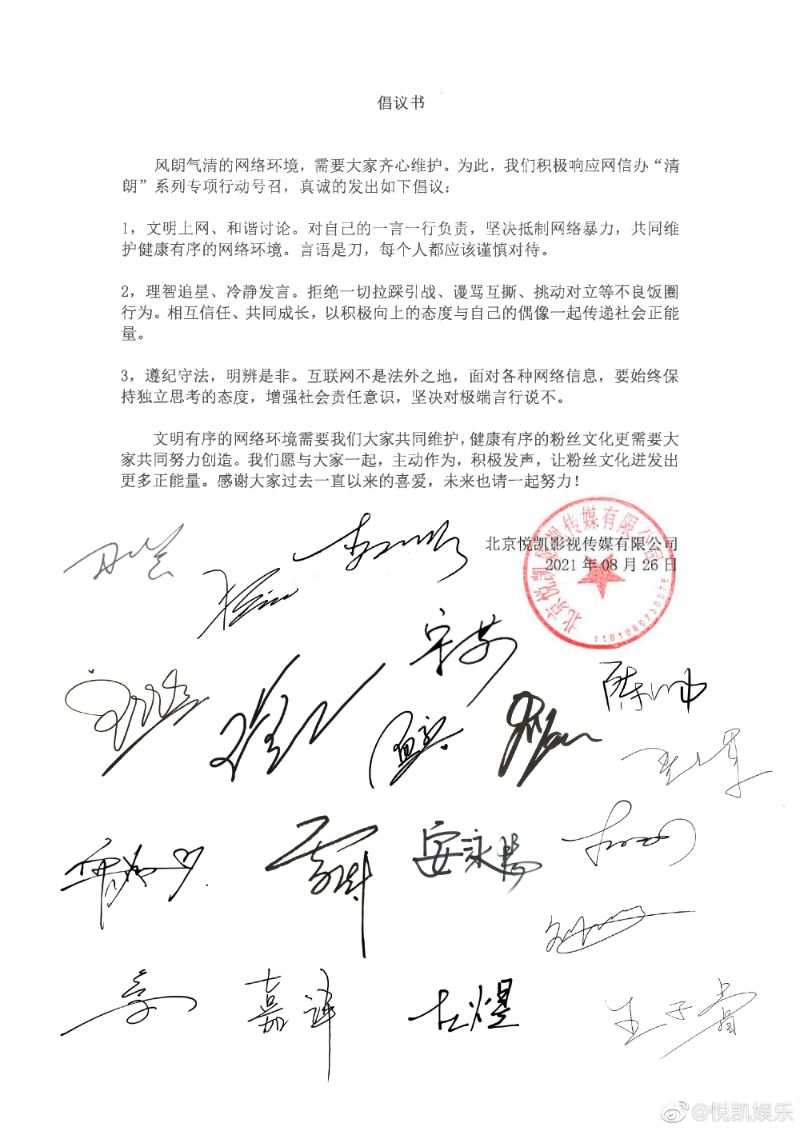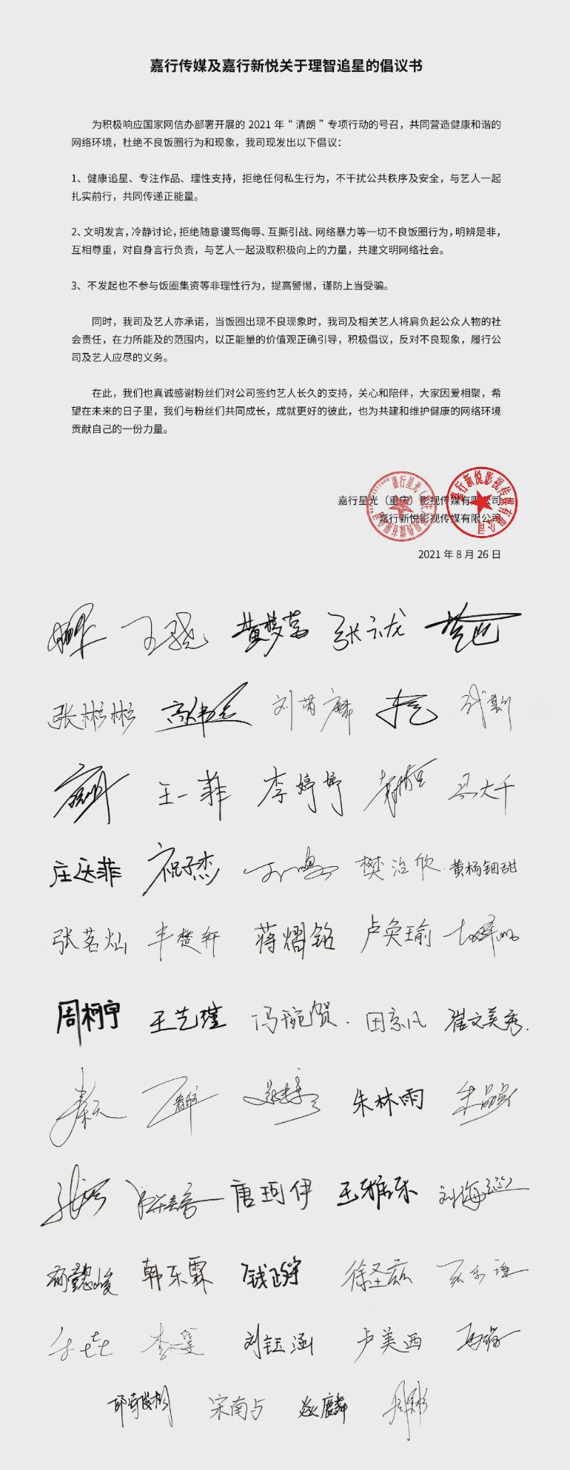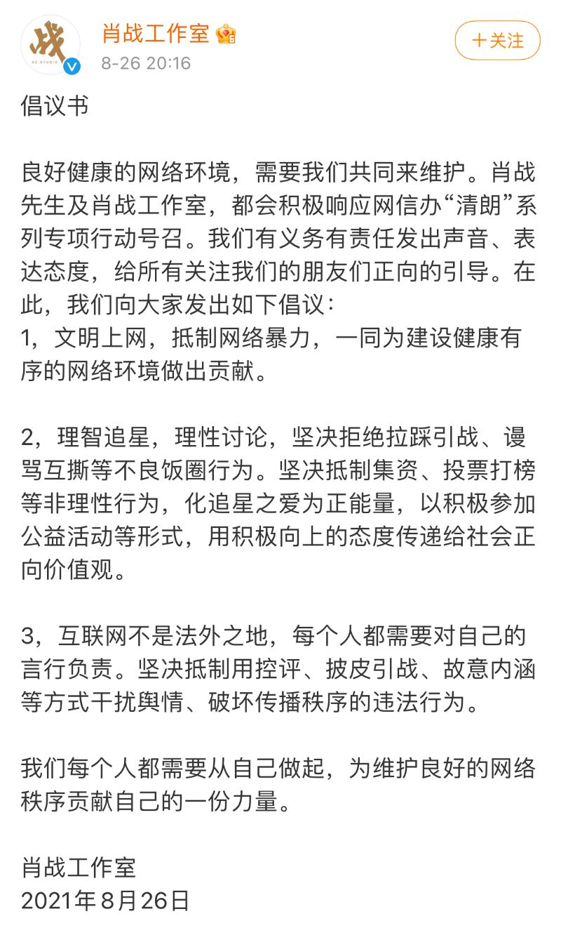 另外,多家明星工作室發布理智追星倡議書,包括了肖戰工作室 、楊紫工作室、嘉行迪麗熱巴工作室 、悅凱娛樂、嘉行傳媒、耀客傳媒、樂華娛樂等紛紛發布理智追星倡議書,號召粉絲理智追星、理智討論,堅決抵制網絡暴力,化追星之愛為正能量。
