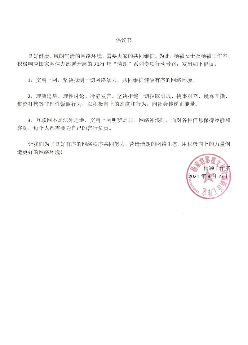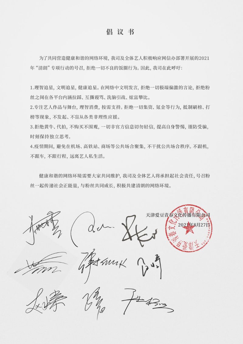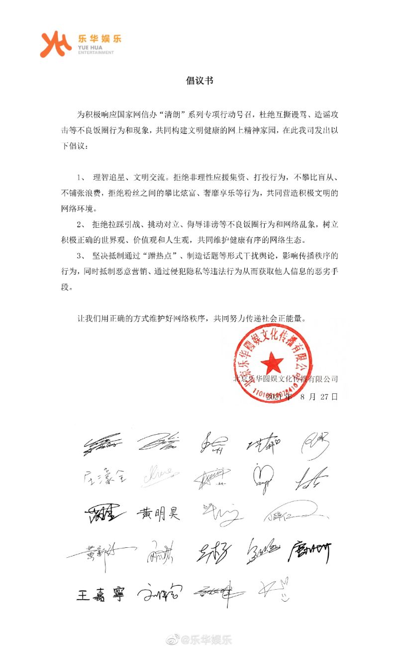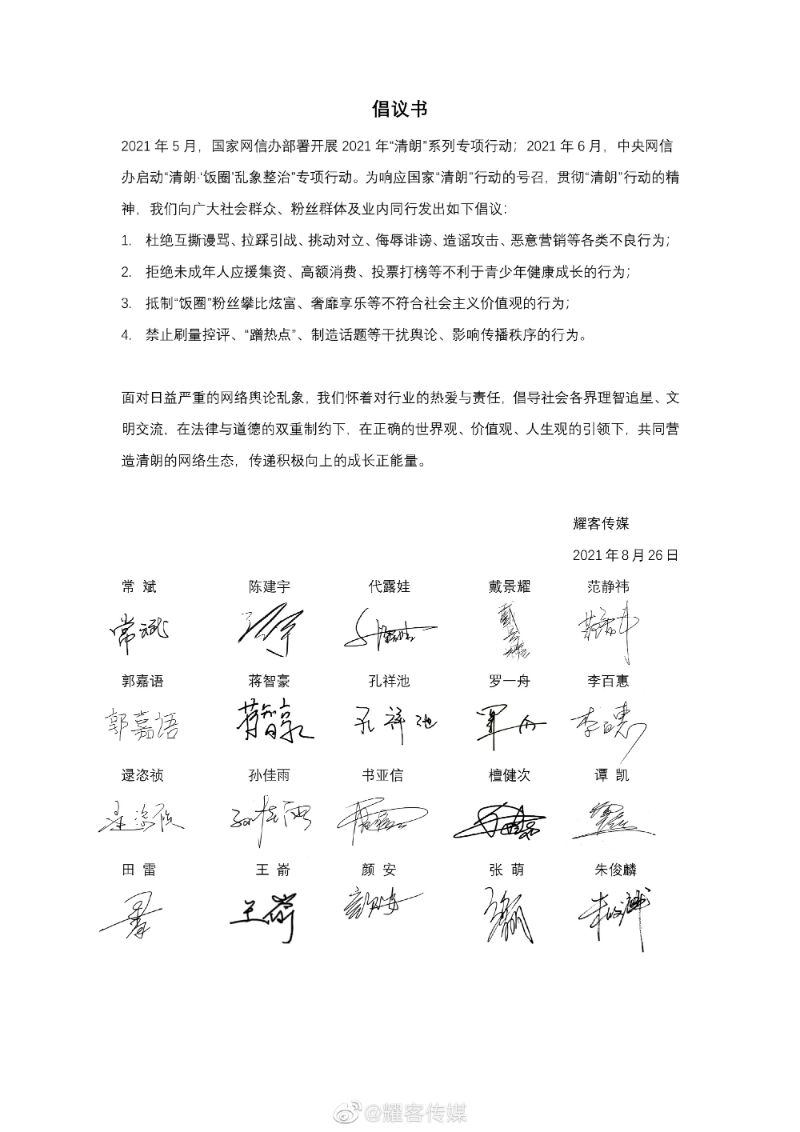 另外,多家明星工作室發布理智追星倡議書,包括了肖戰工作室 、楊紫工作室、嘉行迪麗熱巴工作室 、悅凱娛樂、嘉行傳媒、耀客傳媒、樂華娛樂等紛紛發布理智追星倡議書,號召粉絲理智追星、理智討論,堅決抵制網絡暴力,化追星之愛為正能量。