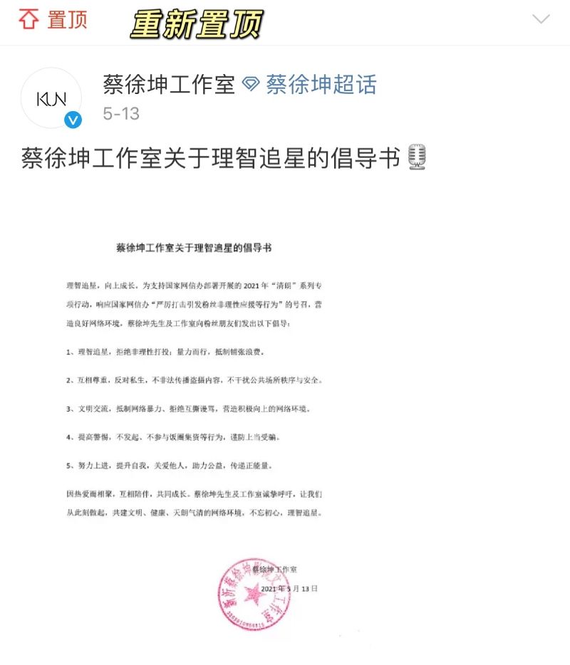 重拳出擊解決飯圈亂象!取消榜單!禁應援!禁互撕!多家明星工作室發布理智追星倡議書!