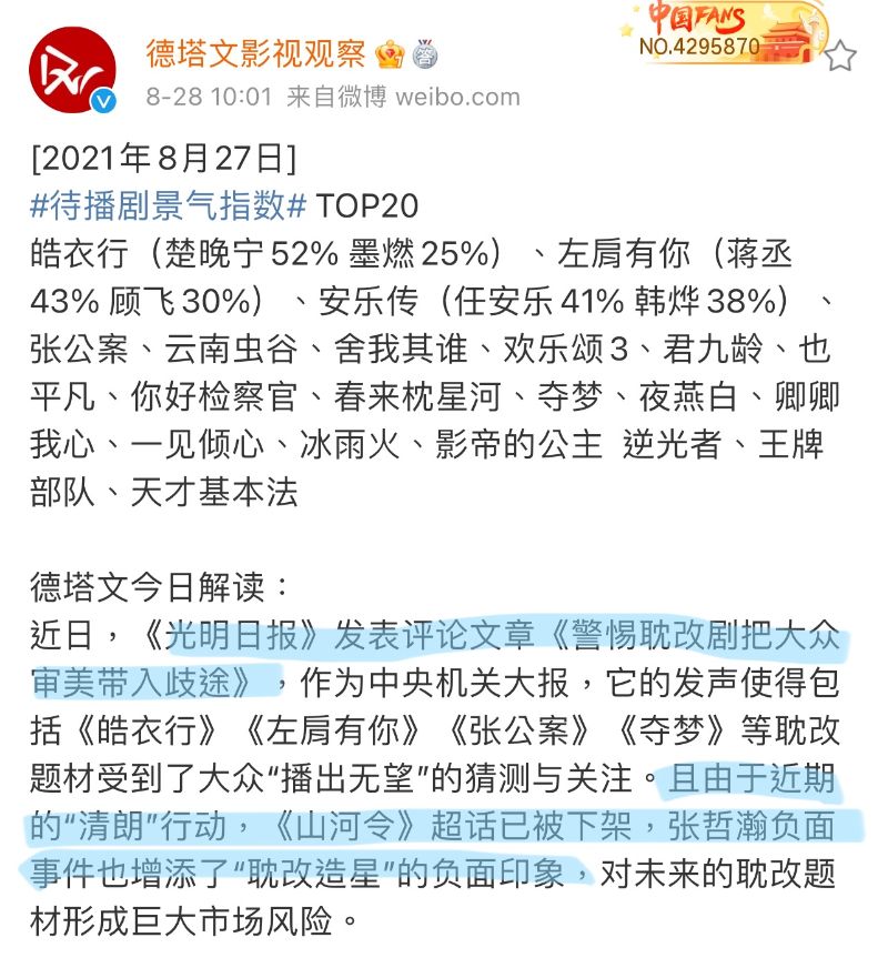 而德塔文方面也根據熱點解讀,認為:「近日,《光明日報》發表評論文章《警惕耽改劇把大衆審美帶入歧途》,作為中央機關大報,它的發聲使得包括《皓衣行》《左肩有你》《張公案》《奪夢》等耽改題材受到了大衆“播出無望”的猜測與關注。且由于近期的“清朗”行動,《山河令》超話已被下架,張哲瀚負面事件也增添了“耽改造星”的負面印象,對未來的耽改題材形成巨大市場風險。」