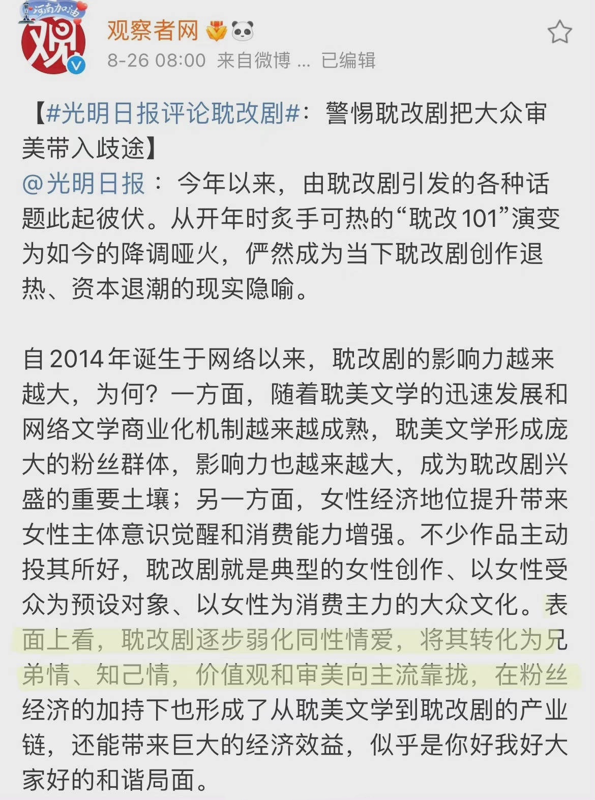 是噠!提到這兩年最紅的劇種,耽改劇可以說是其中一個!自從《陳情令》爆紅之後,2021年開啟了“耽改101”年代。但相對於《陳情令》的“隱晦”和兄弟情,之後的耽改劇似乎越拍越直接,終於引來官媒在8月26日發聲,評論耽改劇把大眾審美帶入歧途的文章。