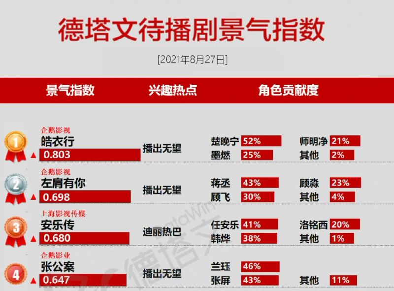 而隨著官媒發聲,也代表目前待播、在拍的耽改劇都十分危險,而在最新公開的德塔文熱點上,8月27日最高討論度的前4部劇中,耽改劇就分別佔了3部,那就是《皓衣行》、《左肩有你》和《張公案》。