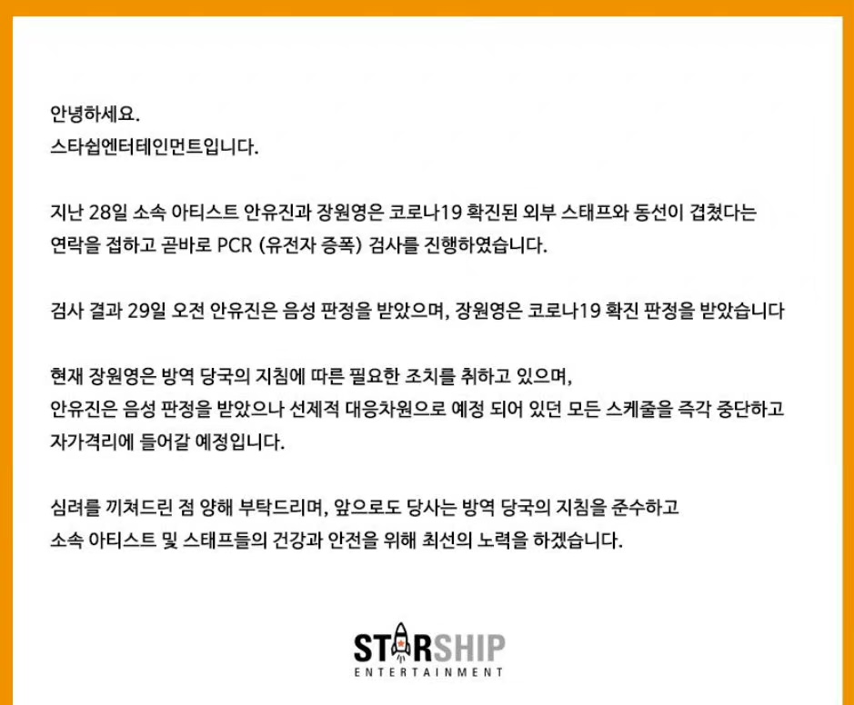 29日,張元英和安宥真經紀公司Starship娛樂通過公告表示:「張元英確診為新冠」,「安宥真被判定為陰性。」