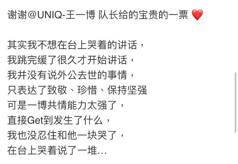隨後Colin發文感謝《這街》,並特別感謝王一博給的寶貴的一票。他表示自己其實不想在台上哭著講話,自己在跳舞前沒有說外公去世的事情,但一博共情能力太強了,直接get到發生了什麼,所以自己才會沒忍住和他一塊哭了。