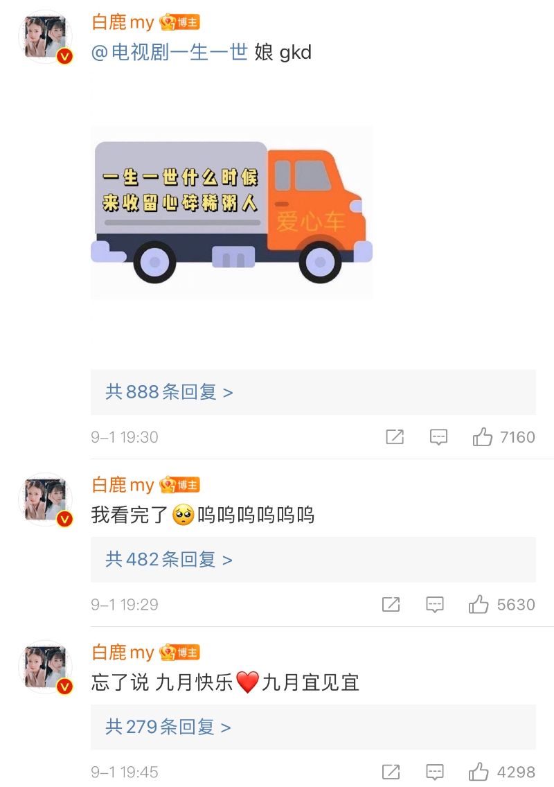 隨後表示「我看完了🥺嗚嗚嗚嗚嗚嗚」,看來我們的時宜今天才看了自己跳城樓的部分啊!最重要的一句,就是白鹿追加的:「忘了說,九月快樂❤️九月宜見宜!」嗚哇!啊啊啊啊!這是暗示《一生一世》即將在9月定檔播出了嗎?