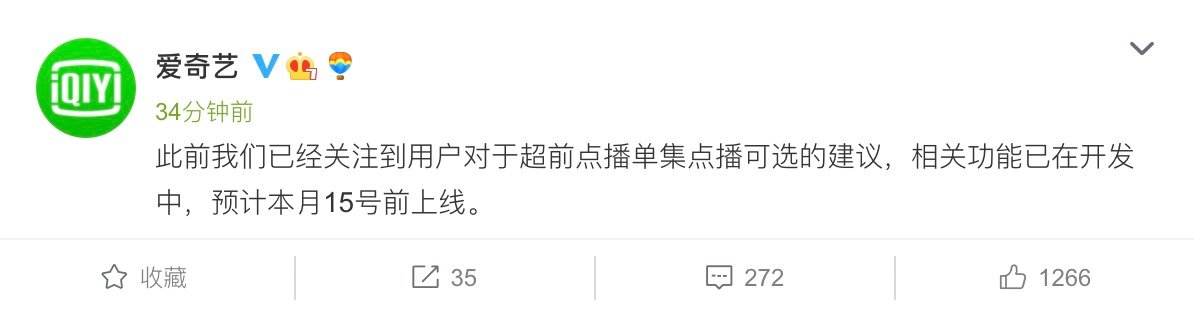 隨後,愛奇藝也發文回應超前點播爭議一事:「此前我們已經關注到用戶對于超前點播單集點播可選的建議,相關功能已在開發中,預計本月 15 號前上線。」