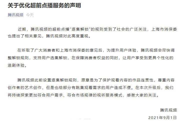 騰訊視頻于9月1日,回應關于超前點播的報道,稱將盡快調整解鎖規則,支持用戶“選集解鎖”,也就是終於不用再一集一集解鎖了!