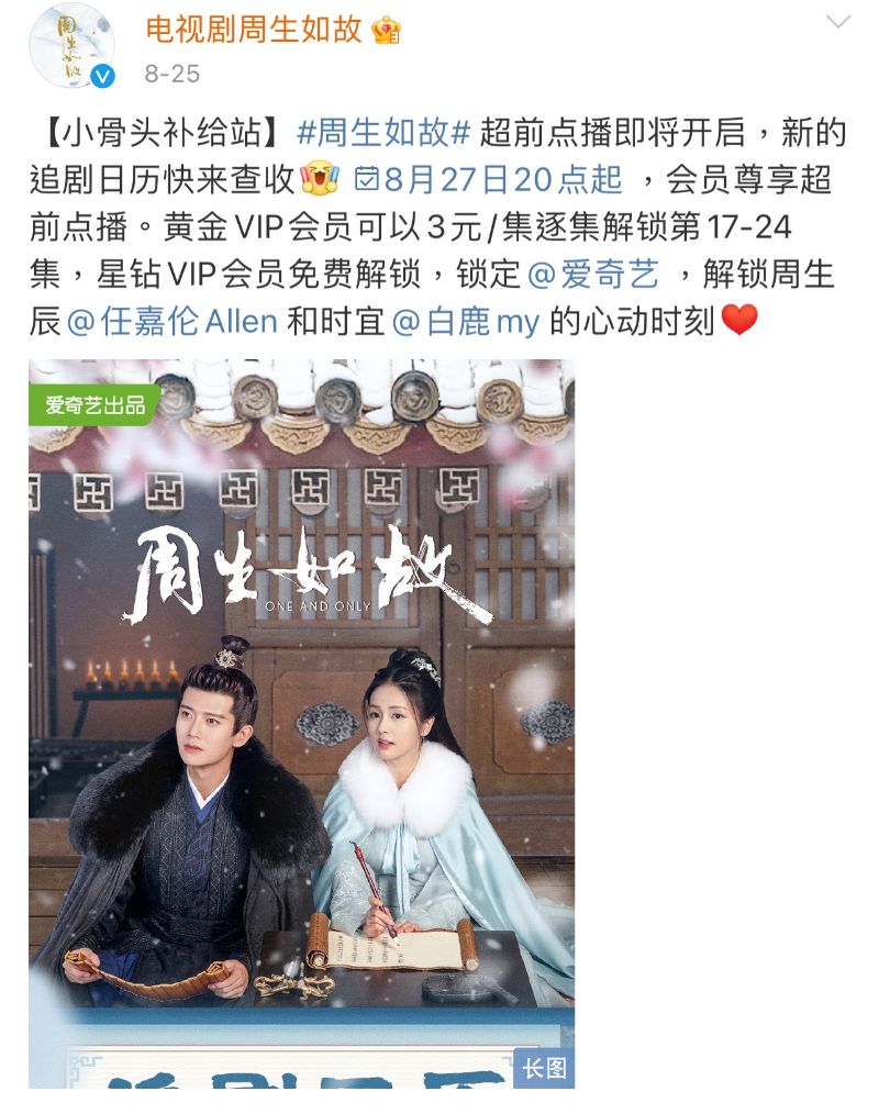 眾所周知,陸劇播放平台除了有會員制,還有一個“超前點播”制,就是會員可以額外付費,就能提早解鎖觀看微博集數。而第一次推出超前點播的,就是在騰訊視頻和愛奇藝播放的《慶余年》。