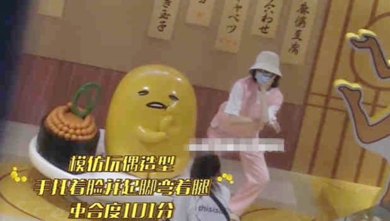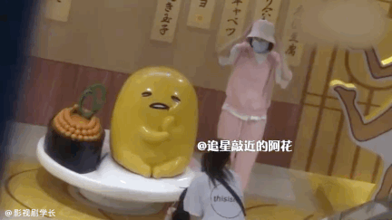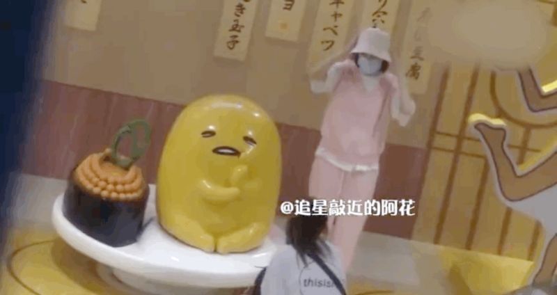 最可愛的部分,是在餐廳門口看到了立牌模仿人物,直接當場模仿起來,完全就像在旅遊景點打卡的你我他啊!來看看,她先是留意到擺在餐廳門口的蛋黃哥玩偶,確認過眼神是要合照的小可愛!