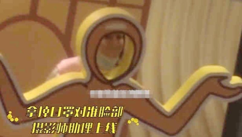 接著留意到身邊還有立牌,立刻摘掉口罩對準臉,美美地拍了一張。