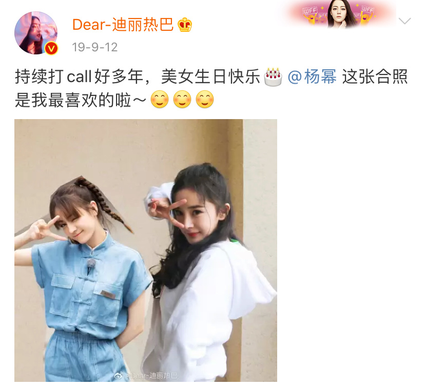 沒錯啦!地球人都知道,迪麗熱巴是楊冪旗下的藝人,而兩人認識這麼多年,每年楊冪生日,熱巴都會風吹不動準時送上祝福!