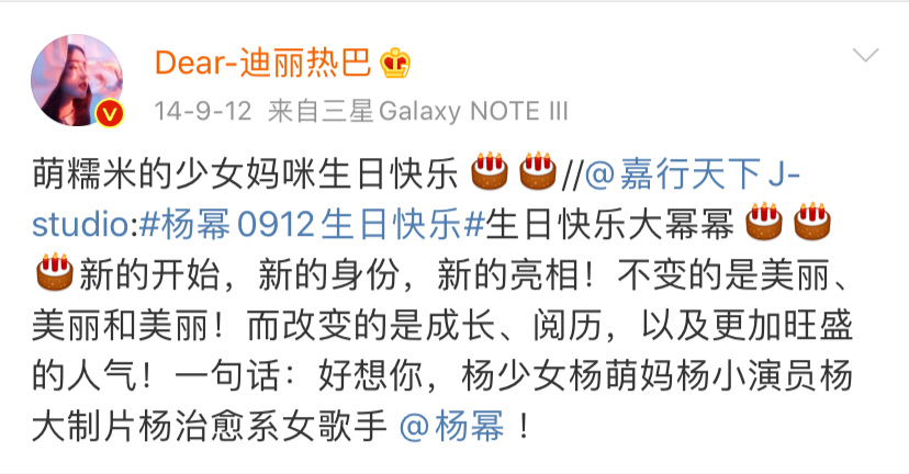 先來看看從2014年開始的生日祝福~那一年大冪冪榮升新手媽咪身份,熱巴的祝福以小糯米的“萌糯米的少女媽咪”開始,以楊冪的各類身份結束,很有心思~