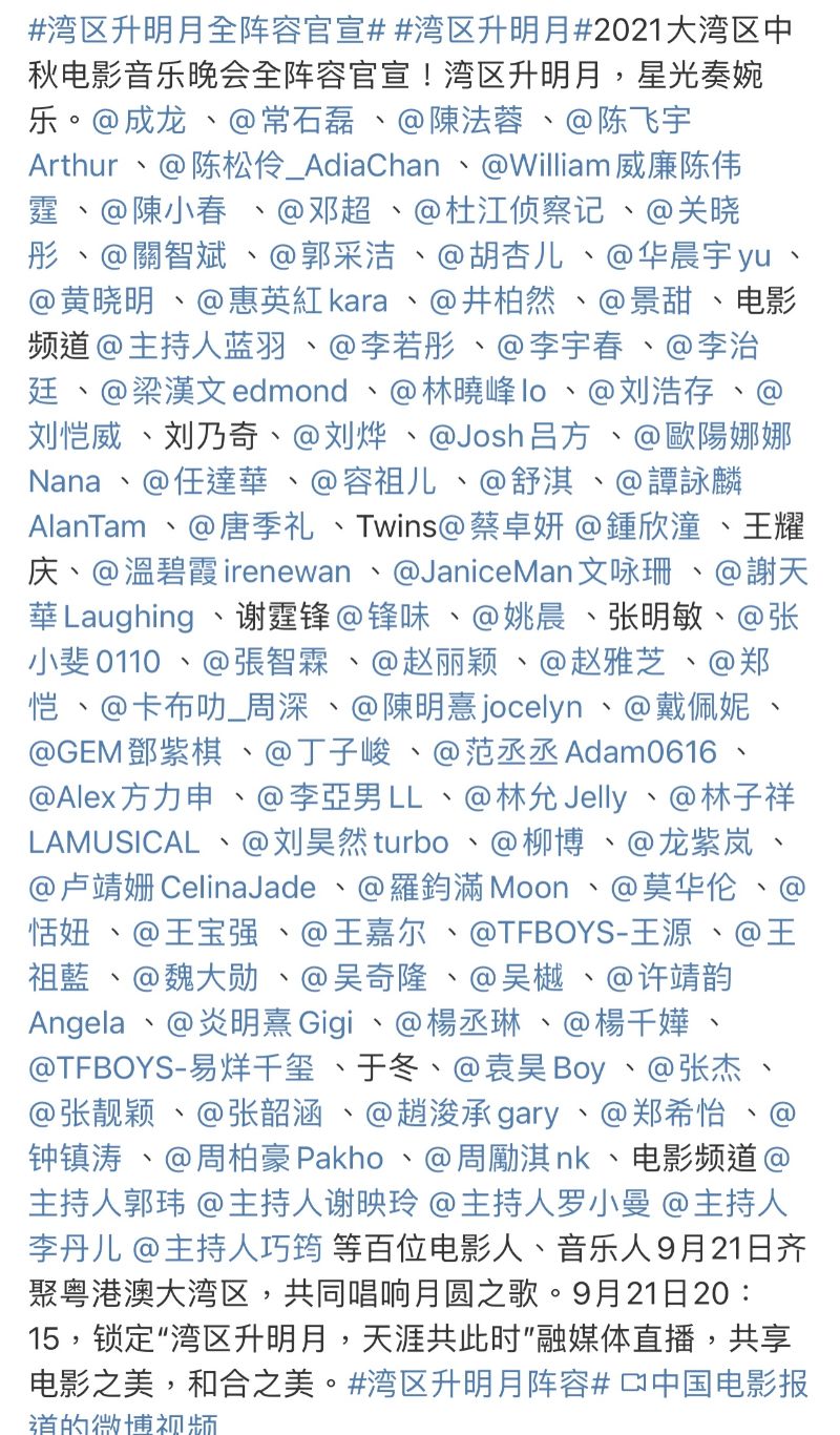 嗚哇!這陣容…也太強了吧!表示《大灣區中秋電影音樂晚會》全陣容終於官宣完畢,官方號稱接近100位的音樂人、電影人參與,將有最熟悉的歌曲、最經典的電影、最美好的陪伴陪你共度中秋!這就來看看部分出席藝人!
