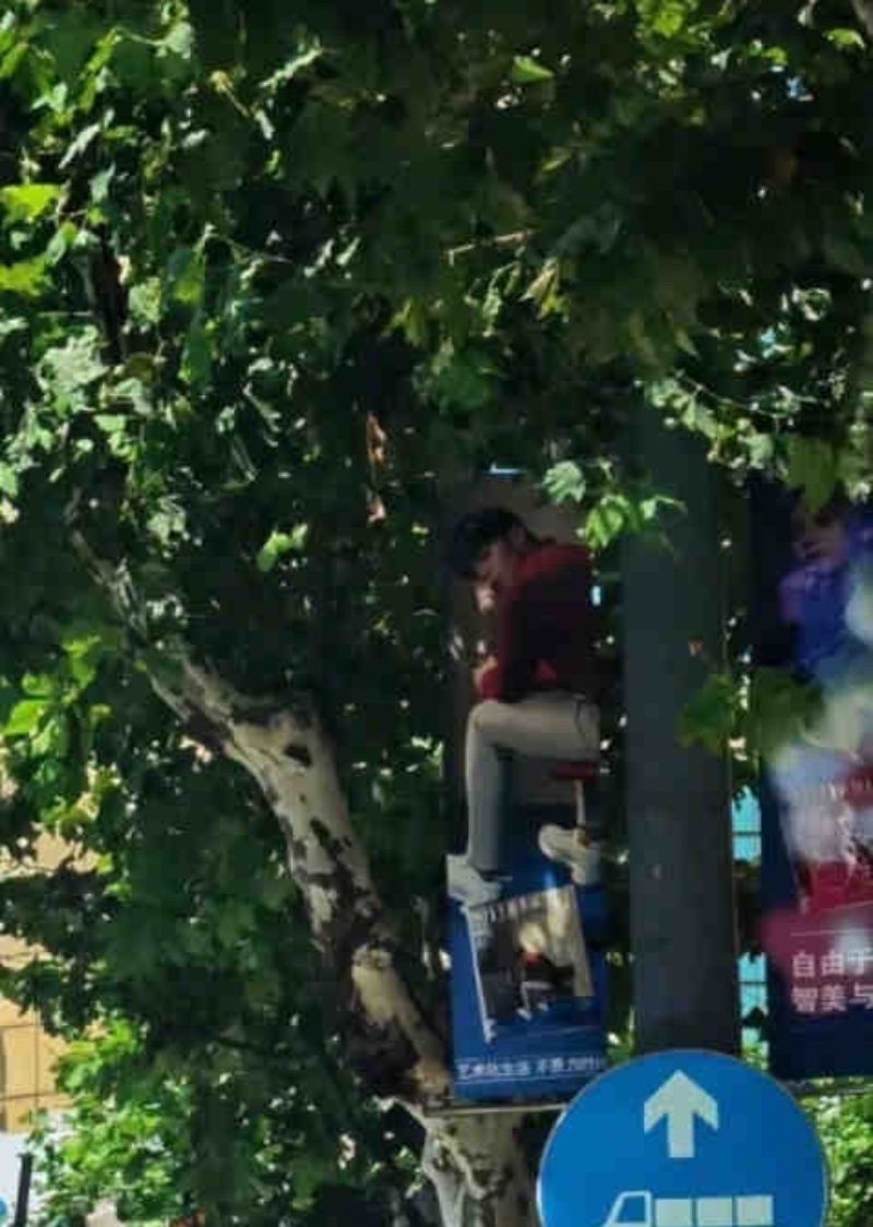 究竟怎麼一回事?放大拉近看看~笑拉了!明明是帥氣的廣告牌,怎麼看起來就像我們倫倫子爬到樹上去啦!
