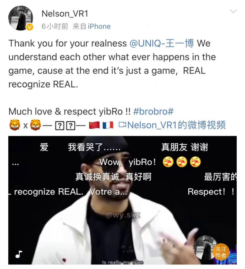 而在22號下午,Nelson更新了自己的微博,轉發了粉絲剪輯他和王一博隊長的互動視頻,並搭配一段話,大意是感謝王一博的真實,表示彼此都理解遊戲中發生了什麼,因為這最終只是遊戲,真實認識真實。最後還表示對王一博非常愛和尊重。