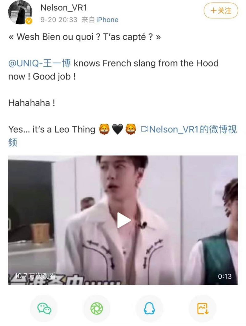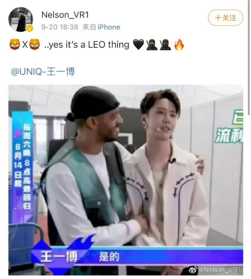 不得不說,Nelson看得出和王一博很投契,在他為數不多的微博中,好多都和王一博隊長有關!