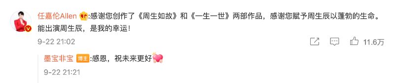 原著者兼編劇發文,辰時CP也速速趕來互動啦!來看看我們的周生老師任嘉倫的留言:「感謝您創作了《周生如故》和《一生一世》兩部作品,感謝您賦予周生辰以蓬勃的生命。能出演周生辰,是我的幸運!」而老師也回復:「感恩,祝未來更好