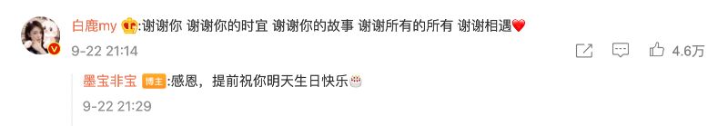 而小十一也來留言啦!留言表示:「謝謝你!謝謝你的時宜!謝謝你的故事!謝謝所有的所有!謝謝相遇❤️」老師回復:「感恩,提前祝你明天生日快樂🎂」沒錯,23號就是我們白鹿27歲的生日啊!
