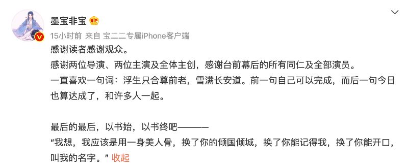 有親媽坐鎮,改編成影劇版自然不會有太大落差!隨著《一生一世》在22號開啟超前點播大結局之後,墨寶非寶也發文,告別這兩部劇!來看看我們的親媽編劇說了什麼👇