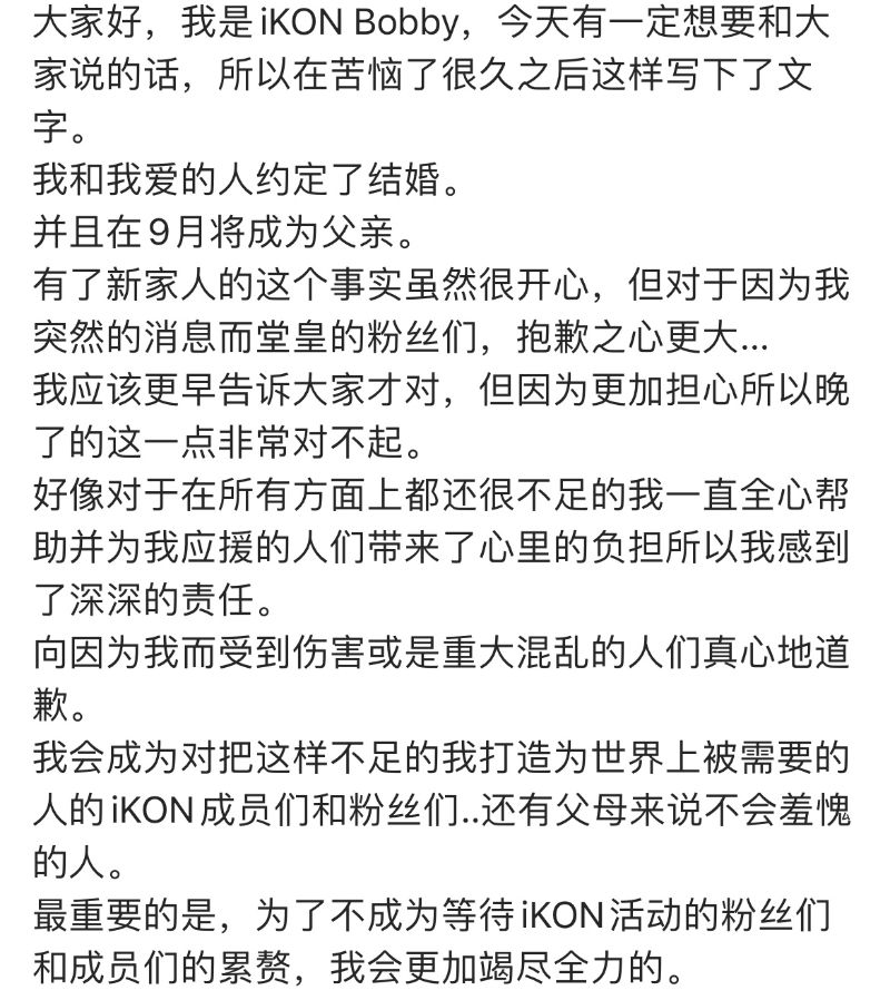 根據spotvnews的報道,BOBBY的孩子最近已經出生,他對孩子的誕生感到非常高興,但沒有公開孩子的性別。BOBBY是在8月20日通過SNS,發表了結婚和即將成為爸爸的消息,尤其即將在9月成為父親這個消息,可以說震驚了整個KPOP界。