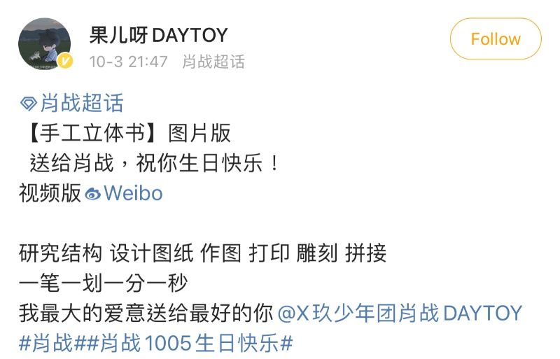 一位ID是「果兒呀DAYTOY」的粉絲,公開了自己為肖戰準備的手工製作立體生日書,看著看著,完全只能對著熒幕跪拜啊!