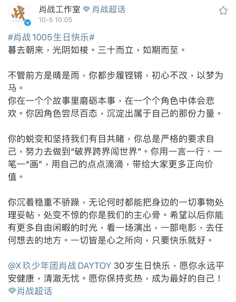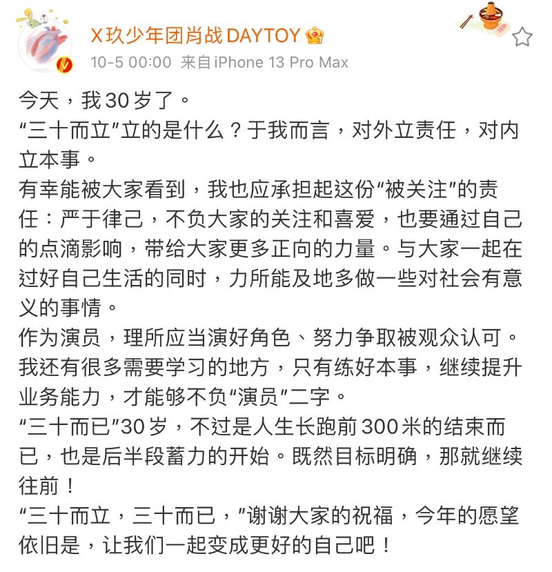 是噠!10月5日是肖戰30歲生日,一如既往,每年生日一定會發文的肖戰,在30而立的這一天,第一次在生日當天,卡點發了生日文~