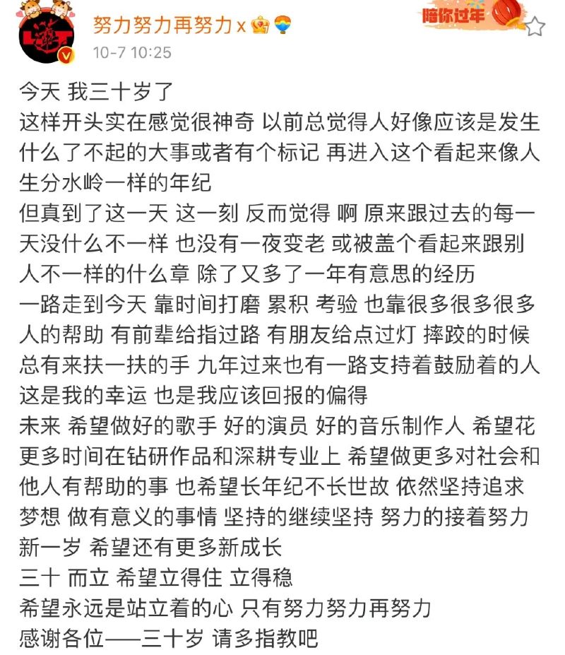 而在生日這天,我們的壽星張藝興也發文,談了自己對於30歲的看法,全文如下👇