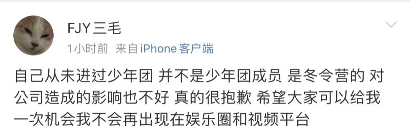 隨著事情引起熱議,付佳源發文為隱瞞性別一事公開道歉,但她強調自己並不是男團成員,只是加入了冬令營,並表示自己不會再出現在娛樂圈和視頻平台。