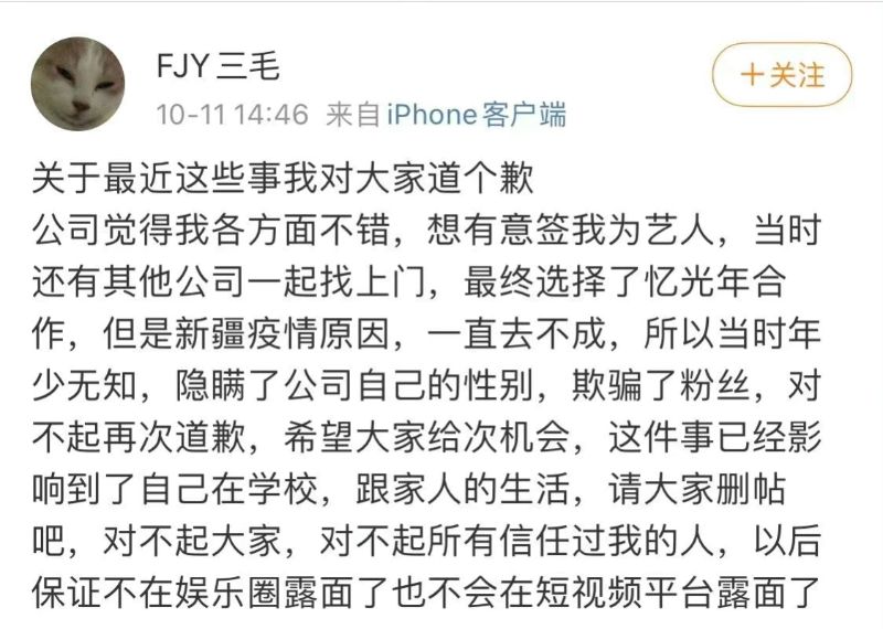 隨後再次發文,解釋事情的來龍去脈。原來是幾家公司有意簽她為藝人,最後選擇了憶光年,但是因為疫情原因,一直去不成。當時自己向公司隱瞞了自己的性別,欺騙了粉絲,再次表達歉意。她也表示,這件事件已經影響到她與家人的生活,懇請網友刪帖,並保證“以後不在娛樂圈露面了,也不會在短視頻平台露面了”。