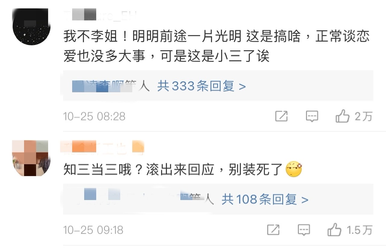 「我不理解,明明前途一片光明,這是搞啥?正常戀愛也沒多大事,可是這是小三了唉!」、「知三當三喔?滾出來回應,別裝死了!」