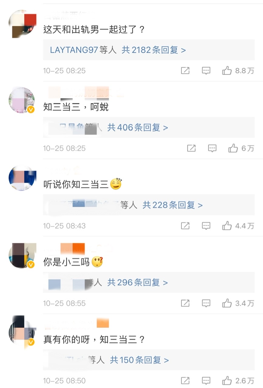 熱評:「這天和出軌男一起過了?」、「知三當三,呵銳」、「聽說你知三當三?」、「你是小三嗎?」、「真有你的呀,知三當三?」