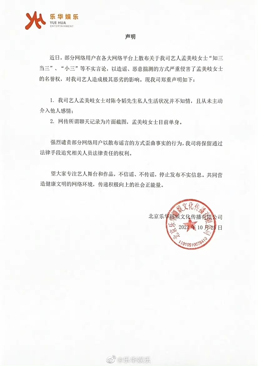 在公開的聲明中,提及孟美岐對陳令韜感情狀態並不了解,另外否認戀情,表示孟美岐目前單身中,還說聊天截圖是片面截圖。