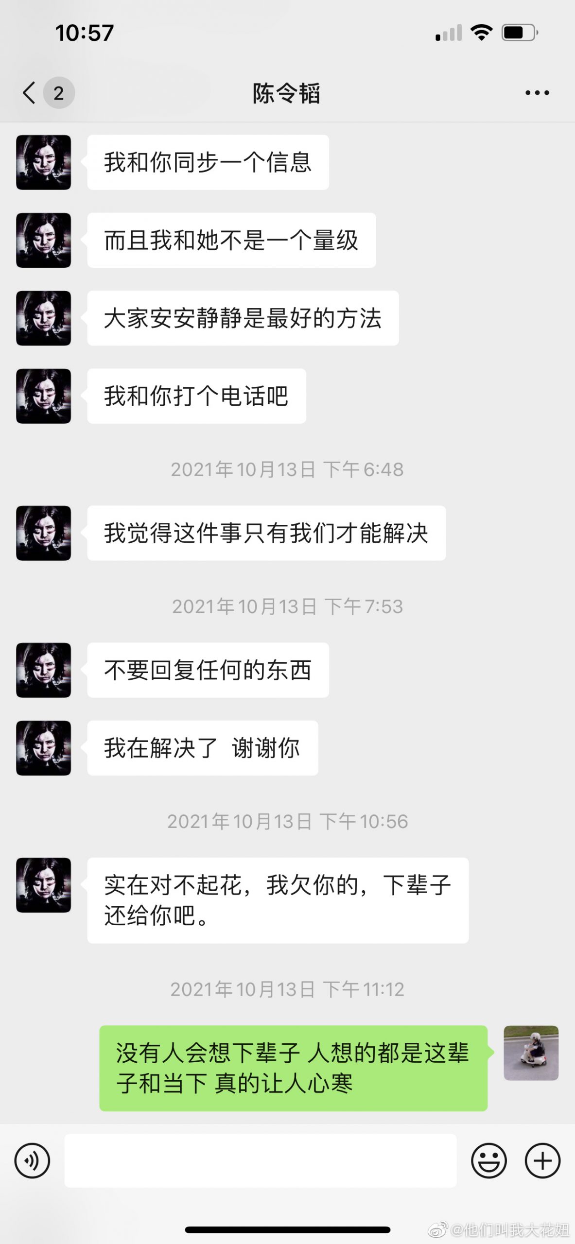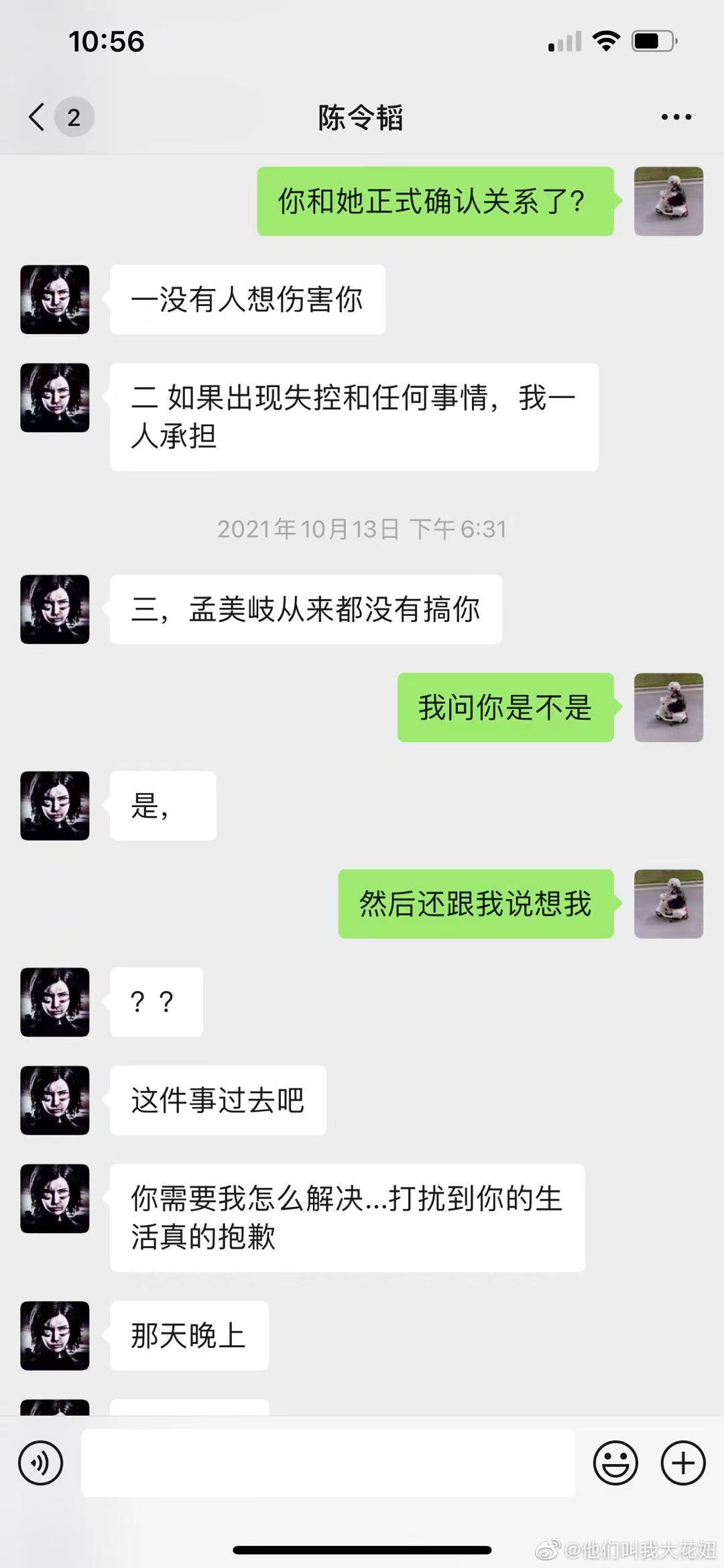 25日凌晨,音樂製作人陳令韜前女友(微博:他們叫我大花妞)發長文爆料陳令韜出軌孟美岐!在她公開的聊天截圖中,陳令韜說“我明確過我有愛的人,她也問過我”,女方質問他們是不是正式確認了關係,陳令韜回答“是”。
