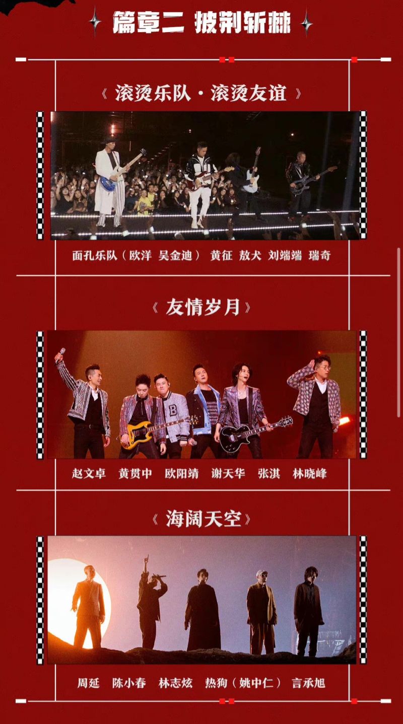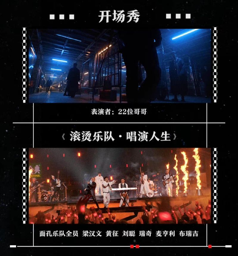 開場秀有22位進入總決賽的哥哥表演,接著就有被淘汰的哥哥們,包括了面孔樂隊(陳輝)、梁漢文、黃征、劉聰、瑞奇、麥亨利、布瑞吉帶來的《滾燙樂隊。唱演人生》!